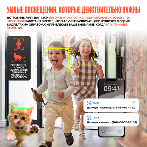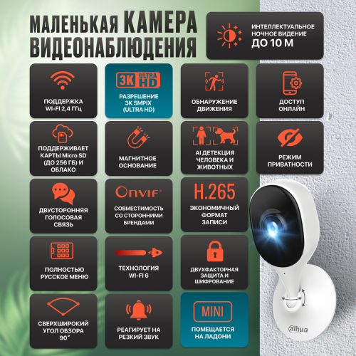 5Мп; 1/3.2” CMOS; объектив 2.8мм; механический ИК-фильтр; чувствительность 0.03лк@F2.0; сжатие: H.265; 2 потока до 5Мп@25к/с; обнаружение людей; ИК-подсветка 10м; встроенный микрофон+динамик; MicroSD до 256Гбайт; питание: 5В(DC); Wi-Fi 2.4ГГц