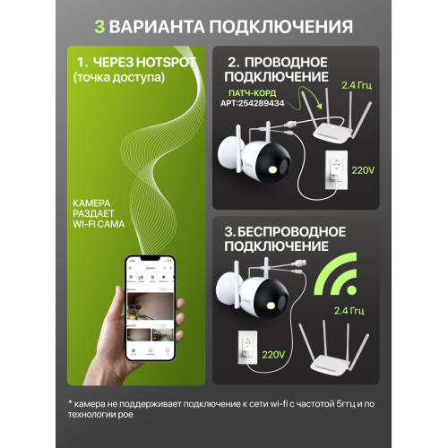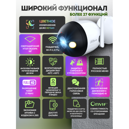 2Мп; 1/3” CMOS; объектив 2.8мм; чувствительность 0.005лк@F1.6; сжатие: H.265+, H.265, H.264+, H.264, MJPEG; 2 потока до 2Мп@25к/с; DWDR; 3D NR; BLC; обнаружение людей; интеллектуальная двойная подсветка; встроенные микрофон+динамик; MicroSD до 256Гбайт; защита: IP67; питание: 12В(DC); корпус: металл, пластик; Wi-Fi 2.4ГГц